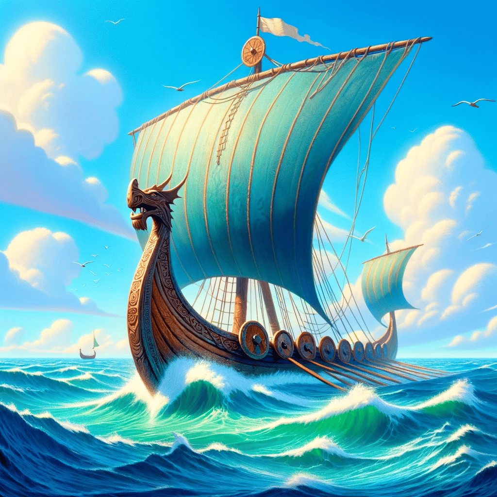 One sunny morning, Erik and his fellow Vikings prepared their sturdy longship, the Sea Dragon, for a grand voyage. The ship was a magnificent sight, with a beautifully carved dragon's head at the prow and a large, billowing sail that captured the wind's power.