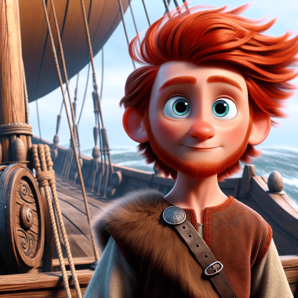 Once upon a time, in a land filled with majestic mountains and deep, mysterious fjords, lived a group of adventurous Vikings. Among them was a young Viking named Erik, known for his bright red hair and insatiable curiosity about the world beyond the shores of his homeland.